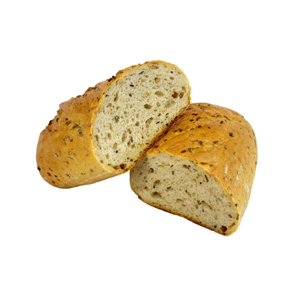Zloženie: pšeničná múka (42%), špaldová múka, pšeničné, špaldové a ražné zrná, ľanové a slnečnicové semienka, sušená cibuľa a cesnak, droždie, voda, soľ, pšeničný lepok, štartovacia kultúra, dextróza, enzýmy